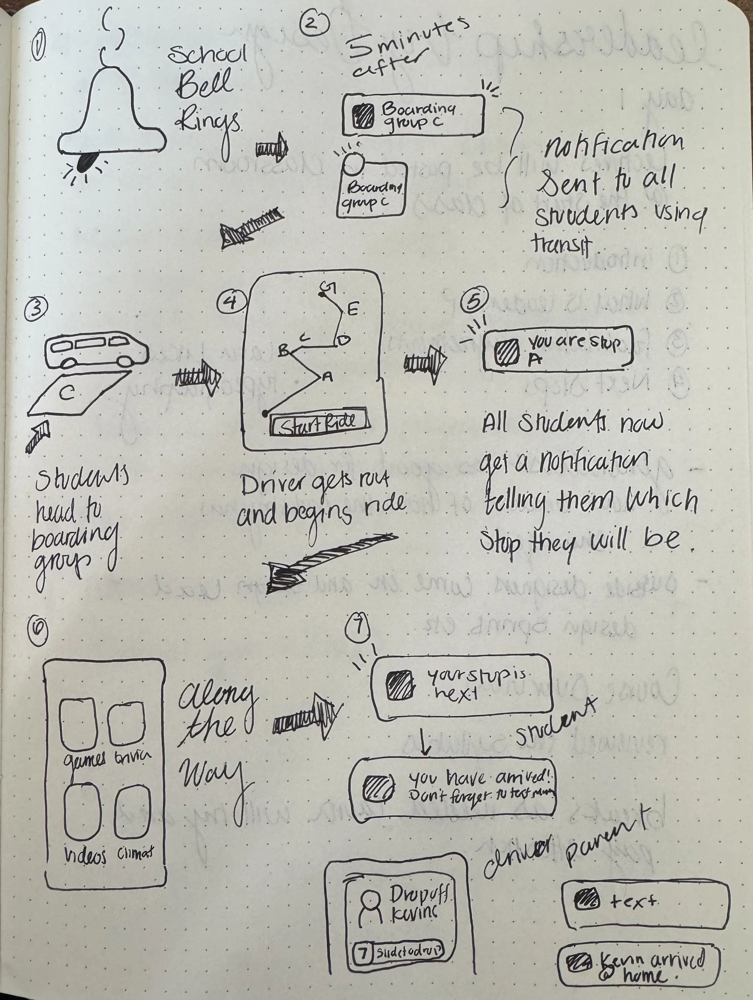 Early on, I interviewed a school psychologist when determining how to go about my design process after focusing on school transportation. I was curious about socialization for students at the school, but I was more curious when she spoke about students whose parents are not available to drive them to school each day due to shift work or overnight shifts.