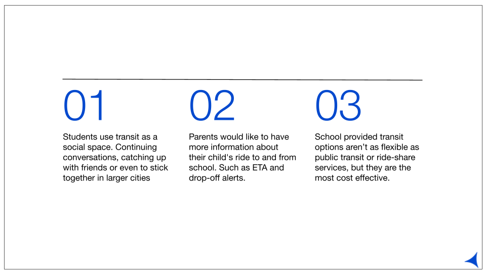 I conducted research using three different methods: desk research, observational research, and interviews with parents and experts. I came away with major findings that helped guide me in creating the solutions to ease the school commute.