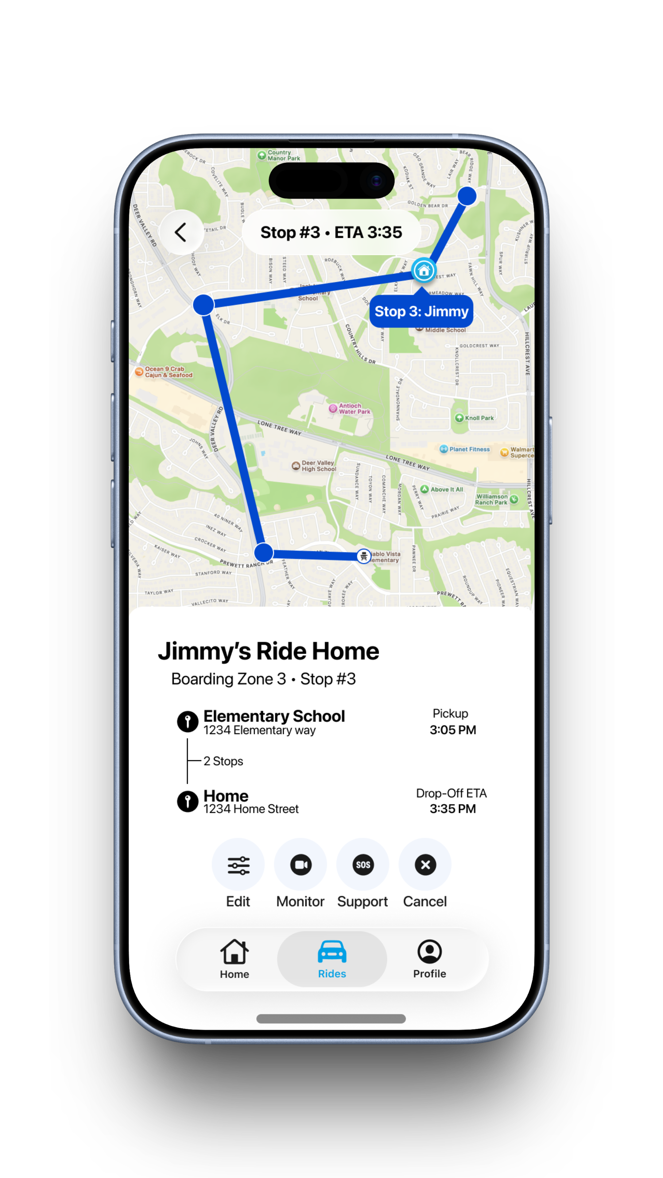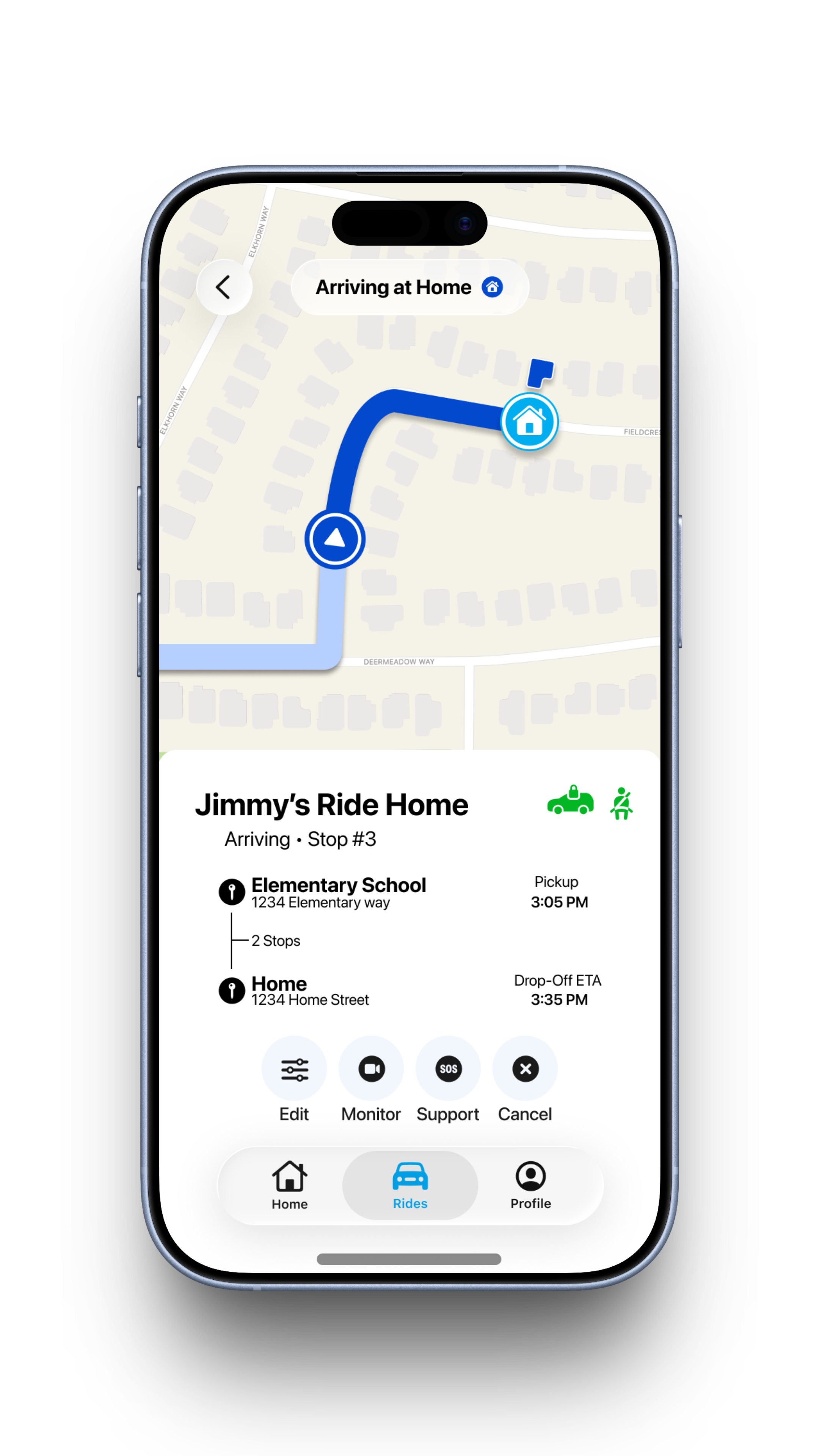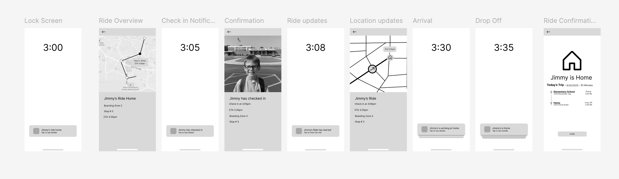 I tested my wireframes with parents who would be using the service and asked for their input, along with their children, on what they would like to see in the final application. Through this user testing, I found there should be clearer buttons for actions, options for setting up rides, and additional safety notifications for parents. I updated my wireframes based on this feedback